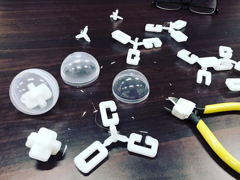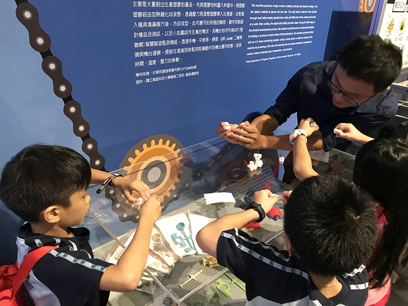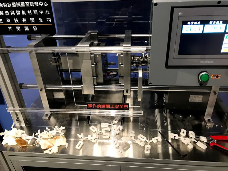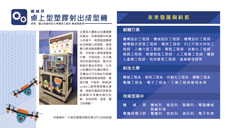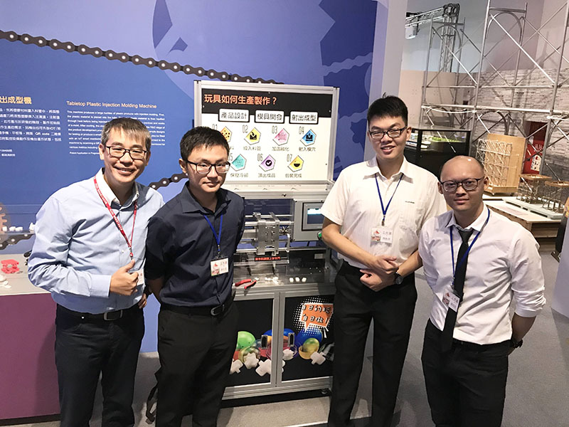 - 本次展出的桌上型塑膠射出成型機台,是由國立高雄科技大學模具工程系鄭瑞鴻教授特別開發製作的教學機台。塑膠射出成型機主要是用來大量射出生產塑膠產品,先將塑膠材料置入料管中,將固態塑膠經由加熱融化成液態,透由壓力將液態塑膠擠入注澆道,注射進入模具填滿模穴後,冷卻成型。透由本教學平台,讓學生在實際操作過程中,了解塑膠射出機的作動⽅式及操作流程。本塑膠射出成型機教學平台,可應⽤於研發階段製作初始設計樣品及測試、以及⼩批量試作生產需求。此外,此機台亦可外掛 IOT 智慧智造監測模組,透由手機、平板等,掃描QR code二維條碼與機台連線,即能在遠端即時監控設備動作,及機台運作的狀態,包括時間、溫度、壓力的參數。