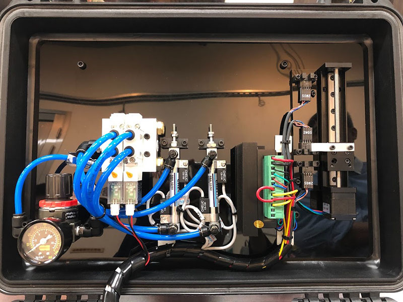 - 透由具三個以上的氣壓缸、及伺服/步進馬達動作 (XYZ軸、夾持、旋轉等),即可進行模擬大部分工廠機械設備動作,以及相關自動化控制的技職丙級證照,如:機電整合、工業配線、氣壓等題型練習,兼具理論學習及技術實作。非常適合給高中職、五專、或大學以上學生的工程科學教育,如果教具箱只有做成靜態、或不能動手改裝,將會過於單調失去趣味性及變化性,而本研究教具產品是自已開發組裝的模組化設計,所以可以依不同需求進行更換模組。而且這個進階版教具產品設計也可提供給中小企業新進工程師,當成容易入門的智慧製造訓練套件,不必引進昂貴且佔空間的學習設備。更可呼應 12 年國教新課程探究與實作的精神與實務。