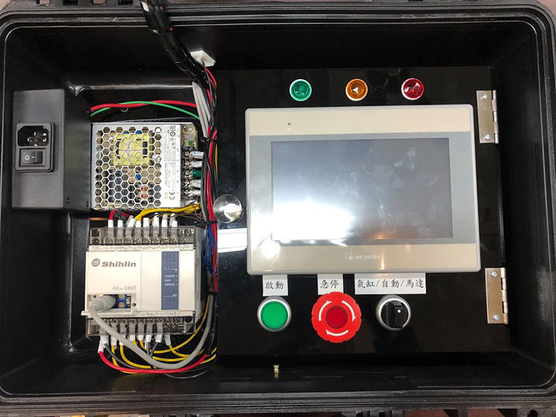 - 本教學平台由智慧機上盒、步進馬達、筆型氣缸、夾爪型氣缸、氣壓壓力調整、電磁閥、可程式邏輯控制器、人機介面等模組所組成。透由此教具可以學習到步進馬達控制、氣缸動作控制、PLC程式設計編寫、人機操作介面設計編寫、網路設定及網頁程式編寫等知識技能。更可透由loT智慧監測模組,以跨平台可攜式設備,即可在遠端即時監控設備動作,及接點運作狀態等,模擬產業界實際各種控制應用。