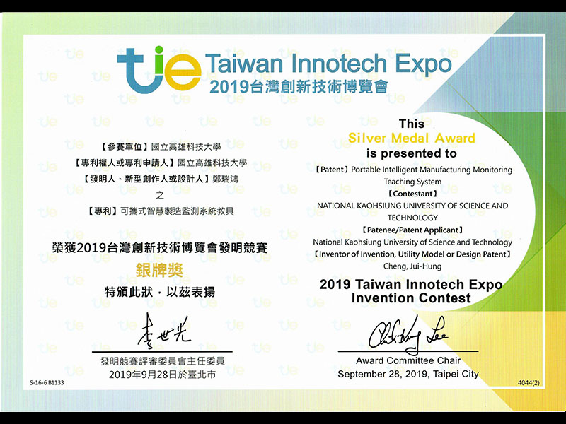 - 發明專利:可攜式智慧製造監測系統教具:台灣發明專利證書第I697875號、 用於模具的智能監測系統:台灣發明專利證書第I673583號、 教學裝置:台灣發明專利公開公開第202011365號、 水果的輔助分裝系統及其分裝方法:台灣發明專利證書第I718918號。
