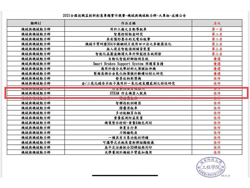 2023 榮獲高科大111年度優良教材教具獎(STEAM仿生機器人)